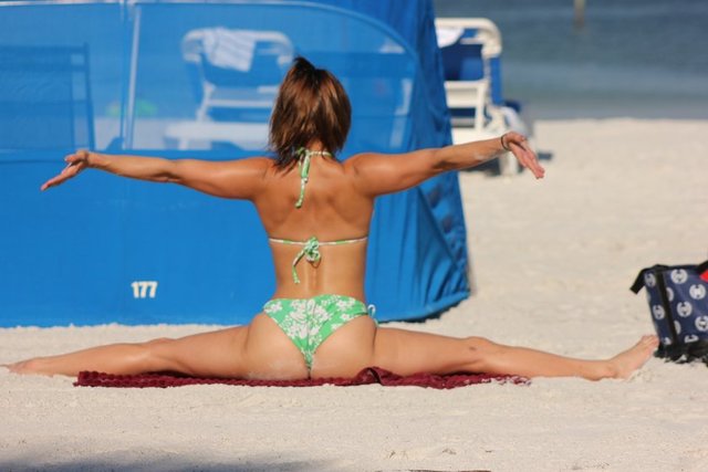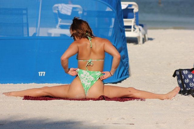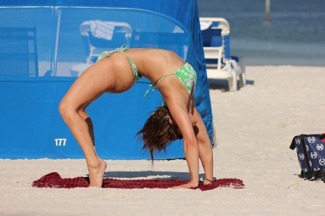 Ünlü manken Maria Jade, Miami kumsalında yoga yaptı. Kaslı vücudunun üzerine giydiği dar yeşil bikinisiyle nefes kesti.