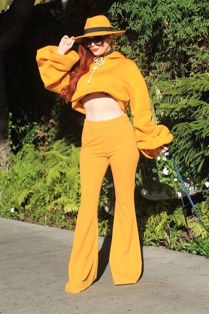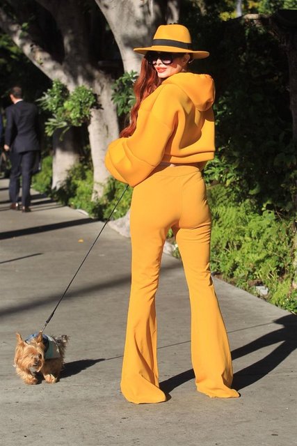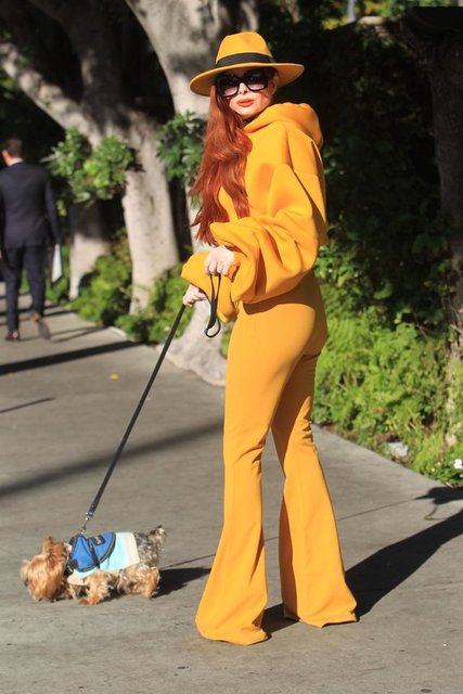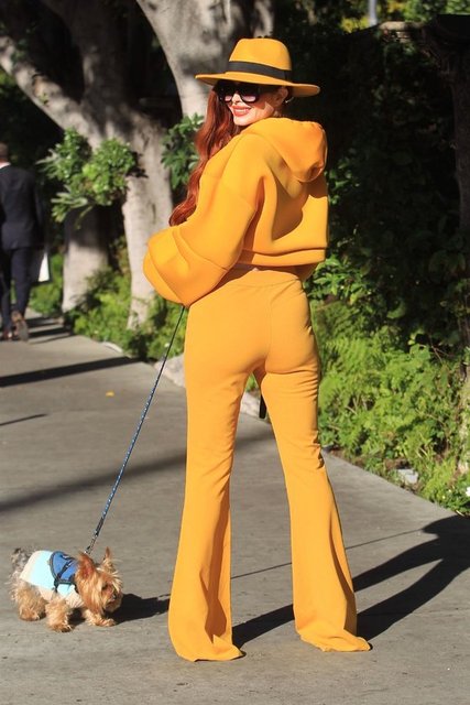 Ünlü oyuncu Phoebe Price, Beverly Hills sokaklarında köpeğini gezdirdi. Sarı pantolonu ve büstiyeriyle dikkat çekti.