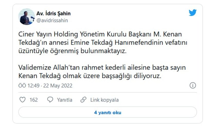 DEVA PARTİSİ GENEL BAŞKAN YARDIMCISI İDRİS ŞAHİN TWITTER HESABINDAN KENAN TEKDAĞ'A TAZİYELERİNİ İLETTİ.