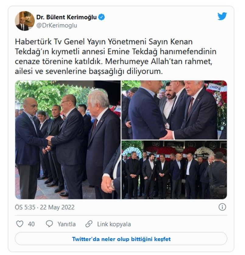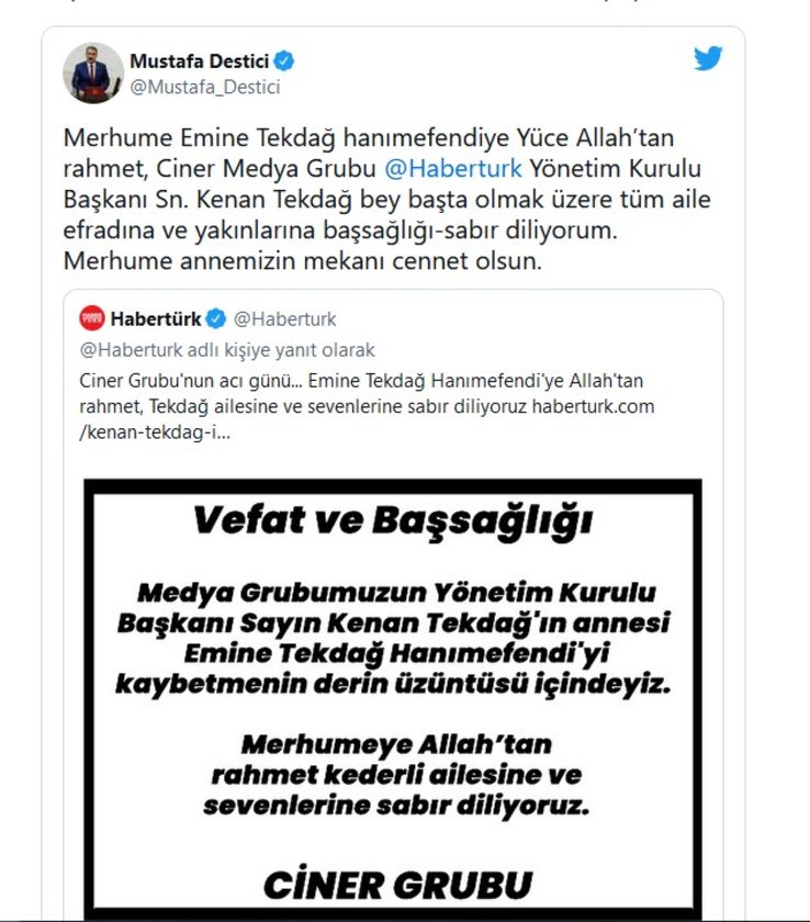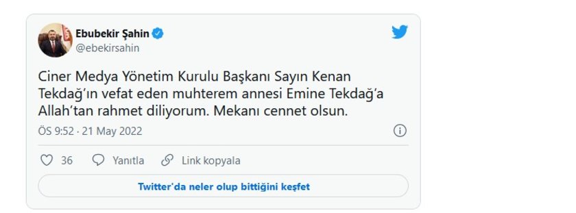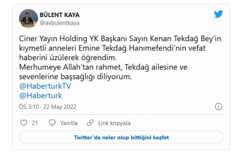 SP GENEL BAŞKAN YARDIMCISI BÜLENT KAYA TWITTER'DAN YAYINLADIĞI MESAJLA TAZİYELERİNİ CİNER YAYIN HOLDİNG AİLESİNE İLETTİ.
