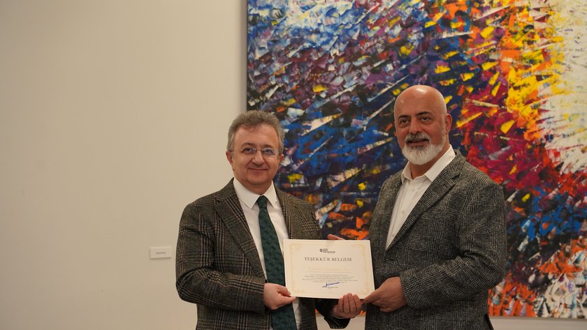 PROF. DR. M. NECMETTİN ATSÜ SANATÇI DENİZHAN ÖZER'E PLAKETİNİ TAKDİM ETTİ.