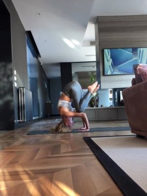 Yoga ve pilatesi hayatından eksik etmeyen Etel Baler evinde yoga yaparken oğlu dayanıklık testi yaptı.